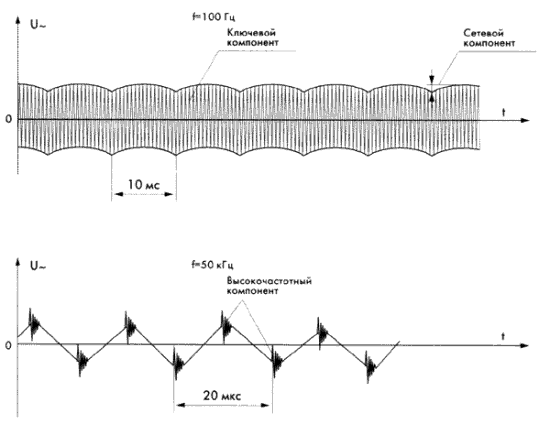 • ключевой компонент — размах напряжения на частоте работы силовых транзисторов преобразователя (типовое значение этой составляющей пульсации составляет 30–100 мВ);