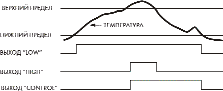 Оба элемента имеют два логических выхода («HIGH» и «LOW»), каждый из которых программируется одним внешним резистором. На TC620 эти выходы имеют активный высокий уровень, логика выходов представлена на рис. 15. Дополнительный выход «CONTROL» устанавливается, когда температура превышает верхний предел, и сбрасывается, когда температура падает ниже нижнего предела. Этот выход может использоваться для управления простым включением и отключением охлаждающего вентилятора или нагревателя. TC621 обеспечивает те же выходные функции за исключением того, что логические уровни на выходах инвертированы.