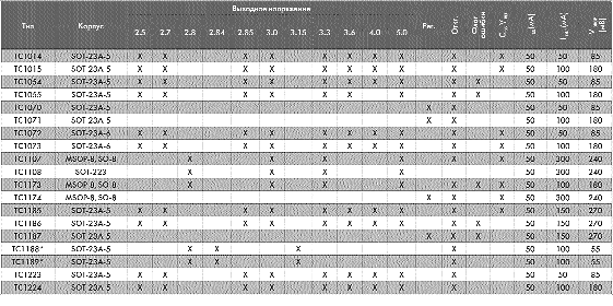 Высокая эффективность стабилизаторов по КМОП-технологии делает их идеальными для модернизации изделий на биполярных элементах типа LP2980 и MIC5205, используемых в сотовых телефонах, пейджерах, переносных компьютерах и других портативных применениях. Микромощные стабилизаторы с малым падением напряжения выпускаются с фиксированным и регулируемым выходным напряжением на токи нагрузки 50, 100, 150 и 300 мA. Миниатюрные корпуса SOT-23A-5, SOT-23A-6, SOT-223 и MSOP-8 требуют минимальной площади платы. Все стабилизаторы имеют вход отключения, тепловую защиту и ограничение тока. Некоторые элементы также имеют выход флага ошибки и вывод для уменьшения шума внутреннего опорного напряжения (табл. 2).