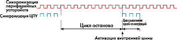 Режим перемежающейся работы CPU характеризуется тем, что в период выполнения команд обращения к регистрам, внутренней памяти (ROM и RAM), I/O, периферийным устройствам или внешней шине тактирование CPU останавливается и, таким образом, выключается основной потребитель. Тактирование устройств, к которым ведется обращение, продолжается на полной скорости. Работу CPU в перемежающемся режиме можно проиллюстрировать с помощью рис. 7.