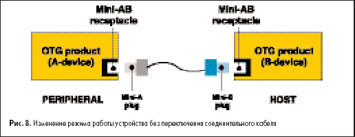Для справедливости следует отметить, что устройства могут поменять режимы своей работы и при неизменном подключении кабеля (что допустимо в рамках HNP). Происходит это следующим образом (обозначения приведены согласно рис. 8): устройство [А] («ведущее») выставляет флаг «HNP Enable» устройству [В]. Затем устройство [A] освобождает шину. Обнаружив это, устройство [B] становится «ведущим». После этого устройство [A] подключает свой нагрузочный резистор на +5 В, индицируя, что готово исполнять роль «ведомого». Далее устройство [B] определяет устройство [A] как «ведомое», перезапускает его, присваивает ему идентификатор и использует. Типы кабелей и разъемов, используемых при OTG-соединении, приведены на рис. 9 и 10.