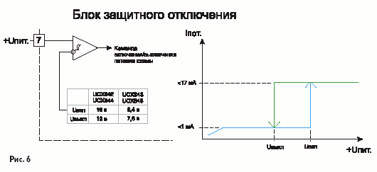 Микросхемы содержат блок защитного выключения при снижении напряжения питания. Блок состоит из триггера Шмитта, имеющего дифференциальные входы, и источника опорного напряжения. С помощью RS-триггера этот блок управляет общим источником опорного напряжения 5 В. Этот источник имеет собственный вывод и обеспечивает ток до 50 мА. В режиме короткого замыкания он способен выдать ток до 100 мА. Пороги срабатывания блока защитного выключения приведены в таблице 1. Кстати, определение «токовые », эти ШИМ-контроллеры получили именно из-за этого самого блока защитного отключения (рис.6). Микросхемы начинают работать при токе потребления около 1 мА и допускают питание от источника высокого напряжения через цепочку резисторов, главное, чтобы обеспечивался диапазон рабочих токов и напряжений по выводам питания. Для этой цели между плюсовой и «земляной » ножкой включен стабилитрон с напряжением пробоя 34 В. Кроме блока защитного отключения на кристалле выполнена схема внутреннего смещения и схема питания логики. Ну и конечно же, непременная часть подобных устройств — генератор импульсов. Он имеет один вывод для подключения времязадающей RC-цепи (рис.7). На минимальную частоту никаких ограничений не указано. Максимальная же частота генератора установлена в 500 кГц. Частота генератора приблизительно рассчитывается по формуле: