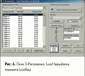 Как было сказано выше, полное сопротивление источника сигнала и полное сопротивление нагрузки данных функциональных элементов обеспечивается индивидуальными элементами SrcImp и LoadImp соответственно. Параметры этих элементов могут быть указаны в соответствующих полях окон задания параметров, а также с помощью внешнего текстового файла S-параметров. Если в окне задания параметров элемента, моделирующего полное сопротивление нагрузки, в поле Enable Reactive Imp не поставить галочку, то сопротивление нагрузки будет чисто активным, а величина его определяется в поле Load Impedance (рис.5).