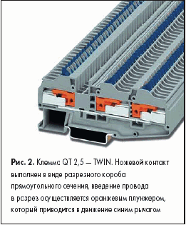 С помощью пластмассового рычаг провод вдавливается в глубину разреза, при этом усилие вдавливания рассчитано так, чтобы края «ласточкиного хвоста » прорезали изоляцию провода и вошли в контакт с центральной жилой, но не перекусили бы ее, причем провод может быть как одножильным, так и многожильным. Таким образом обеспечивается надежный электрический контакт, причем операция зачистки провода перед монтажом исключается. Контакт получается полностью газонепроницаемым, что уменьшает коррозию контакта практически до нуля — это особенно важно для соединений во взрывоопасных атмосферах. Единственный инструмент, который требуется монтажнику — стандартная узкая отвертка, с помощью которой осуществляется перемещение механического привода. Словесно описать принцип работы ячейки QUIX значительно проще, чем реально подобрать сочетание механических характеристик деталей, которое обеспечивало бы надежный контакт при сохранении прочности центральной жилы — поэтому реализация описанного принципа в коммерческих изделиях оказалась довольно растянутой во времени. К настоящему времени формирование линейки завершено, в нее вошли проходные клеммы семейства QT (QUIX Terminal) для подсоединения проводов сечением до 2,5 мм 2 и их различные разветвительные и многопроходные модификации (рис.2). Основные недостатки этой системы — ограниченное количество «перетыканий » провода (извлечь конец из клеммы можно, но перед повторным присоединением ранее использованный для контакта участок придется отрезать) и ограниченность сечения кабеля (не более 2,5 мм 2).
