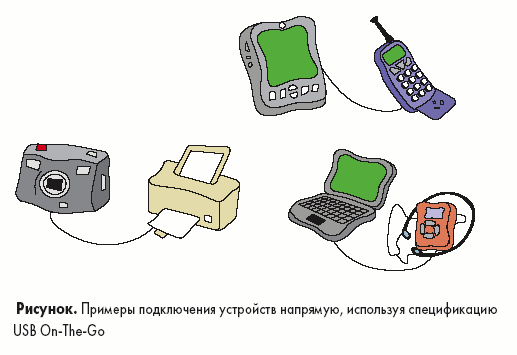 В настоящее время практически все устройства (мыши, клавиатуры, принтеры, сканеры, цифровые фотоаппараты, мобильные телефоны, MP3 плееры) подключаются к компьютеру по интерфейсу USB. А в декабре 2001 года конструкторы USB разработали специальное дополнение к спецификации USB 2.0. В нем рассматривался способ сопряжения двух устройств с интерфейсом USB без посредничества персонального компьютера. Например, можно получить фотоотпечаток, подключив цифровой фотоаппарат напрямую к принтеру (см.рисунок). Это дополнение к спецификации USB было названо On-The-Go (OTG).