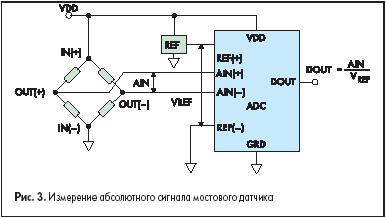 На рис. 2 показана схема мостового датчика, в которой производится измерение соотношения сигналов. Один и тот же источник опорного напряжения используется как для возбуждения датчика, так и для аналого-цифрового преобразователя. Некоторое изменение величины сигнала возбуждения датчика будет компенсировано за счет точно такого же изменения опорного напряжения АЦП, или наоборот. Выходной код АЦП DOUT будет представлять собой соотношение сигналов на входе AIN и на входе VREF. Так как сигнальный вход аналого-цифрового преобразователя и вход опорного напряжения управляются от одного источника, то изменение уровня сигнала этого источника не приведет к появлению погрешности измерений. Таким образом, в схеме измерения соотношений (ratiometric), когда измеряемая величина не изменяется, цифровой сигнал на выходе преобразователя также не изменяется даже при изменении уровня сигнала возбуждения датчика.