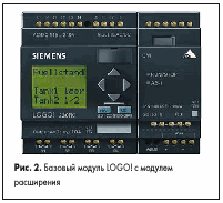 LOGO! — логический модуль с 8 основными и 22 специальными функциями (рис.1). Один логический модуль способен выполнять функции схемы, включающей до 56 таймеров, счетчиков, реле времени, промежуточных реле и т.д. Практическое применение LOGO! становится экономически целесообразным при замене схемы, состоящей, например, из 2 многофункциональных реле или 1 таймера и 3 –4 промежуточных реле.