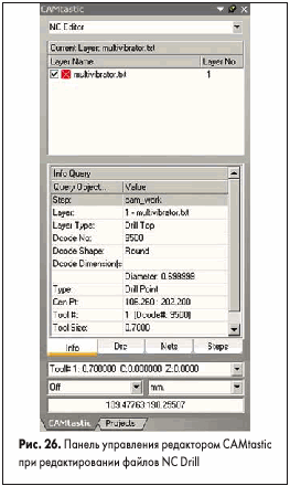 - Нажатием кнопки OK запустим процедуру импорта. На рабочем столе системы Protel DXP откроется редактор CAMtastic в режиме редактирования NC Drill файлов, о чем свидетельствует вид его панели управления (рис.26).