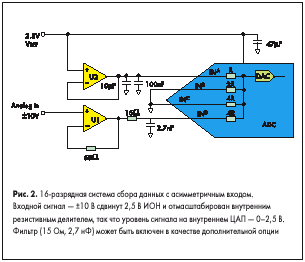На рис.2 показана схема окончания 16-разрядной системы сбора данных, состоящей из АЦП и драйвера (U1), который включен как повторитель. В ней входной сигнал буферизуется, чем обеспечивается высокое входное сопротивление при низком уровне шумов. Высокое входное сопротивление буфера позволяет включить мультиплексор или пассивный фильтр на его вход. 50-омный резистор обратной связи предотвращает звон ОУ. Дополнительный низкочастотный фильтр, стоящий непосредственно перед входом АЦП, состоит из 15-омного резистора и конденсатора емкостью 2,7 нФ. Он уменьшает шумовую полосу пропускания ОУ и служит сглаживающим фильтром.