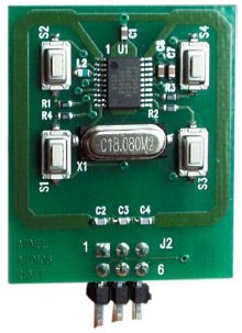 На плате размерами 35x30 мм смонтирован полный передатчик, включая антенну, выполненную печатным способом. На обратной стороне платы припаяно гнездо для установки дисковой литиевой батарейки. В качестве приемника рекомендуется микросхема Т5744 с внешним контроллером.