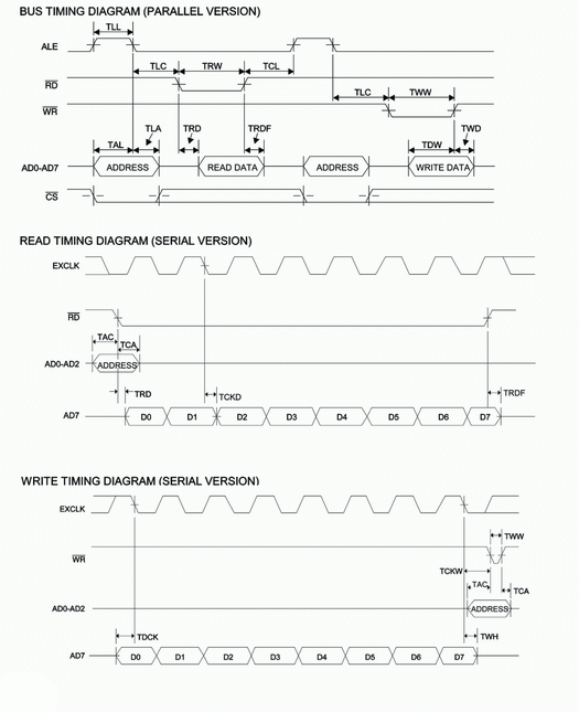 Последовательный интерфейс предназначен для доступа к регистрам управления и состояния через последовательный порт (только 22–выводный вариант). В этом режиме на линиях А0, А1 и А2 устанавливаются адреса регистров для данных по управляющим сигналам на шинах RD или WR (временные диаграммы на рис.2).
