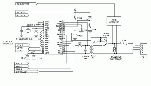 Если у вас нет желания или возможности заниматься блоком сопряжения с телефонной линией, то в этом случае можно использовать модем 73K222BL, в который встроен гибридный ключ для 2/4–проводной линии. Насколько при этом облегчается жизнь разработчика, видно из схемы на рис. 5.
