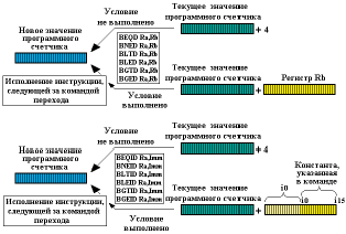 Инструкции BEQ Ra,Rb и BEQI Ra,Imm инициируют передачу управления по заданному адресу при условии, что значение содержимого регистра общего назначения с номером a равно нулю. Адрес перехода формируется путем суммирования текущего значения программного счетчика и смещения, которое указывается в виде содержимого регистра Rb (в команде BEQ) или результата знакового расширения 16-разрядной константы Imm до 32-разрядного слова (в команде BEQI). При исполнении команд BNE Ra,Rb и BNEI Ra,Imm управление передается инструкции с указанным адресом только в случае, если значение содержимого регистра общего назначения с номером a неравно нулю. Инструкции BLT Ra,Rb и BLTI Ra,Imm загружают новое значение адреса в программный счетчик при условии, что значение содержимого регистра Ra меньше нуля.