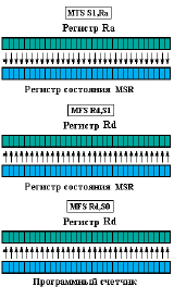 Команда MFS Rd,Sa выполняет копирование содержимого одного из регистров специального назначения Sa в регистр общего назначения с номером d. При использовании в инструкции MFS в качестве второго параметра S1 производится копирование содержимого регистра состояния MSR. Если в качестве второго параметра указано значение S0, то в регистр общего назначения Rd записывается содержимое программного счетчика. Рисунок 32 иллюстрирует выполнение специальных инструкций.