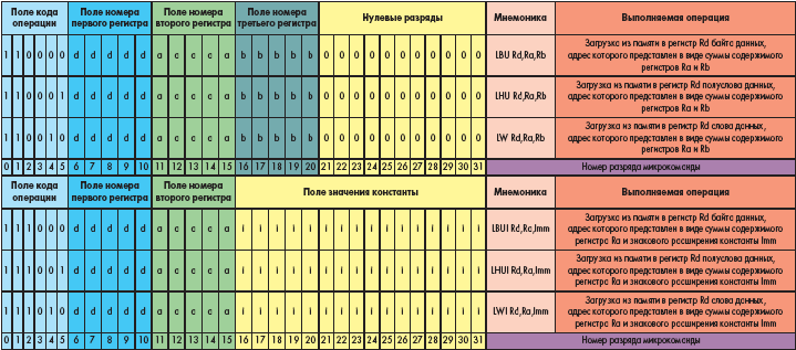 Данную группу составляют инструкции, предназначенные для организации обмена данными между памятью и регистрами общего назначения. В системе команд микропроцессорного ядра MicroBlaze предусмотрены инструкции, позволяющие передавать данные в виде слов размерностью четыре байта (32 двоичных разряда), полуслов размерностью 2 байта (16 двоичных разрядов) и побайтно (8 двоичных разрядов). При выполнении операций обращения к памяти используется косвенная адресация. Значение адреса памяти при выполнении операций чтения или записи представляется в виде суммы содержимого некоторого базового регистра общего назначения и смещения.