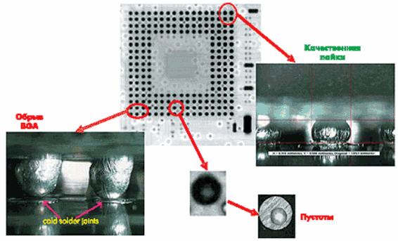 Оба метода обеспечивают примерно одинаковый уровень выявляемости дефектов для большинства дефектов пайки, включая дефекты BGA, хотя 2D AXI благодаря лучшему контрасту изображения позволяет идентифицировать мелкие и труднораспознаваемые дефекты пайки (такие как непропай), а способность распознавать более мелкие объекты и границы паяных соединений позволяет распознавать дефекты пайки BGA. Хочется сказать особо об одном чрезвычайно важном положении, которое, кстати, может служить косвенным свидетельством качества программного обеспечения рентгеноскопических систем. Заключается данное положение в том, что именно программное обеспечение должно принимать окончательное решение об исправности тестируемого изделия. Поясняет данное положение рис. 5. При внимательном изучении этого рисунка становится понятно, что даже имея рентгеноскопическое изображение BGA, оператор не может принять корректное решение о годности пайки его шариков без программно выполняемого автоматического анализа. Заметим, что такой анализ имеют и могут качественно выполнять далеко не все рентгеноскопические системы.
