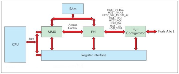 Интерфейс внешнего хоста (External Host Interface – EHI) позволяет микроконтроллеру eCOG1 и внешнему процессору использовать внутреннее ОЗУ eCOG1 для прямого доступа как со стороны процессора микроконтроллера, так и со стороны внешнего устройства ( рис. 9). Запись и чтение данных в ОЗУ процессор микроконтроллера выполняет через блок управления памятью MMU, в то время как внешнее устройство – с помощью EHI. Прямой доступ к памяти микроконтроллера внешний процессор получает в одном из двух режимов: первый — eCOG1 представляется как периферийное устройство с распределением памяти (ММР), в котором оперативная память отображается в карте памяти внешнего устройства; второй – режим прямого доступа к памяти DMА, когда внешнее устройство обращается к памяти микроконтроллера eCOG1 с использованием функций DMА. Режим ММР предназначен для передачи небольших произвольных объемов данных, а DMА – для больших блоков данных. Интерфейс EHI дает в руки разработчику средство чередования доступа к большим и малым массивам данных.