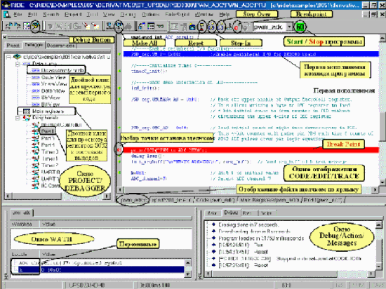 Встроенная в кристалл ядра µPSD turbo система отладки обеспечивает мощный режим трассировки. Для его включения или отключения используются опции окна "Опции трассировки" ("Debug | Trace | Options"). Вид основных окон IDE RIDE, используемых для отладки приложений с µPSD33xx демонстрируется рисунком 2.