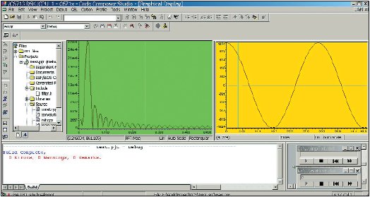 Необходимо запустить CCS и создать новый проект. Напомним, что для этого в главном меню ИСР нужно выбрать раздел Project, в нем — пункт New, затем в появившемся диалоговом окне выбираются семейство ЦСП и тип проекта, а также указываются место размещения проекта на жестком диске и его имя. В папку проекта необходимо скопировать файлы с исходным С-кодом рассмотренного в прошлой статье фильтра, за исключением файла с функцией main(). Скопированные файлы, кроме заголовочного файла, подключаются к проекту (в главном меню раздел Project, пункт Add Files to Project).