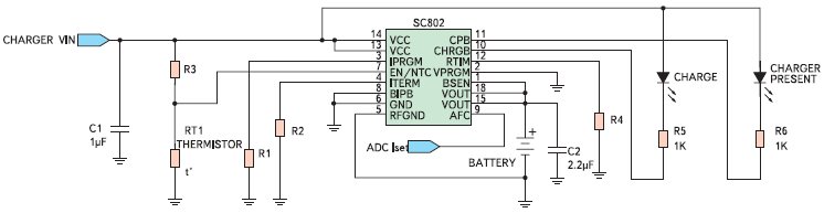 В таких устройствах, как мобильные терминалы сбора данных, носимые переговорные устройства, мобильные телефоны и терминалы GSM/GPRS на основе встраиваемых модулей, терминалы торгового зала или склада и т. п., общим свойством которых является сравнительно высокое энергопотребление и высокие требования к минимизации массогабаритных характеристик, наиболее эффективно использовать Li-Ion аккумуляторы. Они обладают наилучшим соотношением стоимости, габаритов, энергетического потенциала и удобства эксплуатации. Если по функциям мобильного прибора предполагается периодическое подключение к стационарным устройствам, например, для обмена данными по стандартным интерфейсам, то выгодно, параллельно с обменом, подзаряжать аккумулятор, и потому наличие встроенного узла заряда является технически верным. Тогда к встроенному узлу заряда предъявляются жесткие требования по габаритам. И серия контроллеров заряда SC80x им удовлетворяет: все микросхемы серии выпускаются в миниатюрных корпусах (4Q4 мм и 3Q3 мм) для автоматизированного монтажа на поверхность.