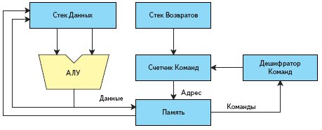 Текущее положение вершины стека обозначает указатель. Данные в АЛУ могут быть считаны из вершины стека — TOS (top of stack) и из следующей за вершиной ячейки— NOS (next of stack). Данные из АЛУ помещаются в вершину стека. Кроме этого, стековая машина должна поддерживать команды обмена данными между TOS и NOS. А для того чтобы работать с вызовами подпрограмм, такая архитектура должна иметь еще и стек возвратов.